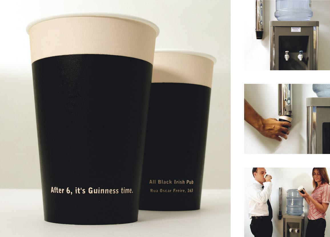 Сотрудники пьют пиво посреди рабочего дня? Publicis и бары All Black Irish Pub придумали необычные стаканчикиОригинальный способ придумало рекламное агентство Publicis, чтобы прорекламировать сеть баров All Black Irish Pub. В офисах, расположенных недалеко от этих пабов, были размещены не совсем обычные бумажные стаканчики для воды. Верх у них белый, а нижняя часть черная. Таким образом, они напоминают стакан с темным пивом. Надпись: "Время после шести - это время Guinness. All Black Irish Pub." Агентство: Publicis, S?o Paulo Творческий директор: Ti?o Bernardi, J.R. Delboux, Ricardo Furriel Арт директор: Denis Kakazu Копирайтер: Denis Kakazu, Guilherme Facci |