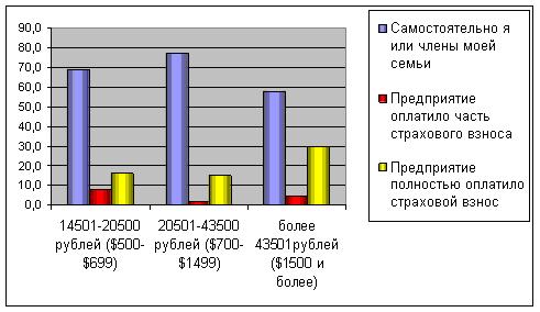 Готовы ли москвичи платить за медицинские услуги?По данным исследования TGI-Premier (Стиль жизни среднего класса) за 2006 год, 14 % представителей среднего класса в Москве имеют медицинскую страховку (ДМС). 69% респондентов с доходом USD 500- 700 на человека в семье покупают страховку сами, 16-и процентам в этой же доходной группе страховой полис полностью оплачивает предприятие. 7-и процентам респондентов с таким доходом предприятие оплачивает страховой полис частично. 77,5% представителей среднего класса в Москве с доходом от USD 700 до 1500 оплачивают страховку самостоятельно, и 15-и процентам этой группы эти расходы полностью оплачивает предприятие. Что касается самой высокодоходной группы (от USD 1500 на человека в семье и выше), 29% людей страховку оплачивает компания, и 58% ее оплачивают сами. Чем выше зарплата сотрудника, тем чаще она сопровождается социальными пакетами в виде медицинской страховки. Относительная небольшая доля людей (14%), имеющих платную медицинскую страховку, объясняется, прежде всего, наличием в стране обязательного медицинского страхования. Другой фактор - отсутствие драматической разницы в профессиональной подготовке врачей, работающих в платных и государственных поликлиниках. Конкуренцию им составляют крупные медицинские научные центры или Медицинская Академия, которые, как правило, не входят в число медицинских учреждений, предлагаемых страховыми компаниями. ![]() Источник: TGI Premier (Стиль жизни среднего класса), 2006 |