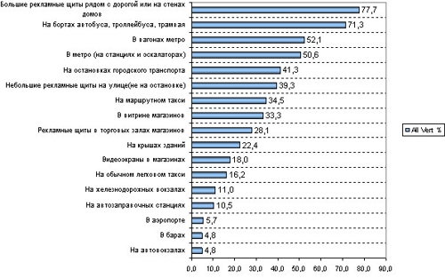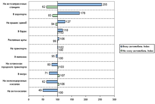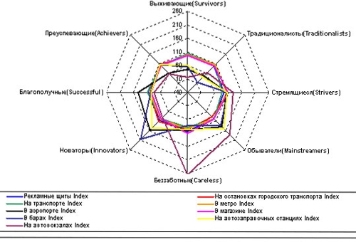 Компания «КОМКОН» также выделила несколько особенностей, связанных с так называемыми психографическими типами жителей. (Согласно классификации компании, можно выделить восемь психографических типов потребителей: выживающие, традиционалисты, стремящиеся, обыватели, беззаботные, новаторы, благополучные, достигшие успеха). Замечать рекламу в аэропорту наиболее характерно для «благополучных» и «новаторов», в барах — исключительно для «новаторов», на автозаправочных станциях — в большей степени для «новаторов» и «обывателей», а вот «беззаботным» свойственно запоминать наличие рекламы на автовокзалах.