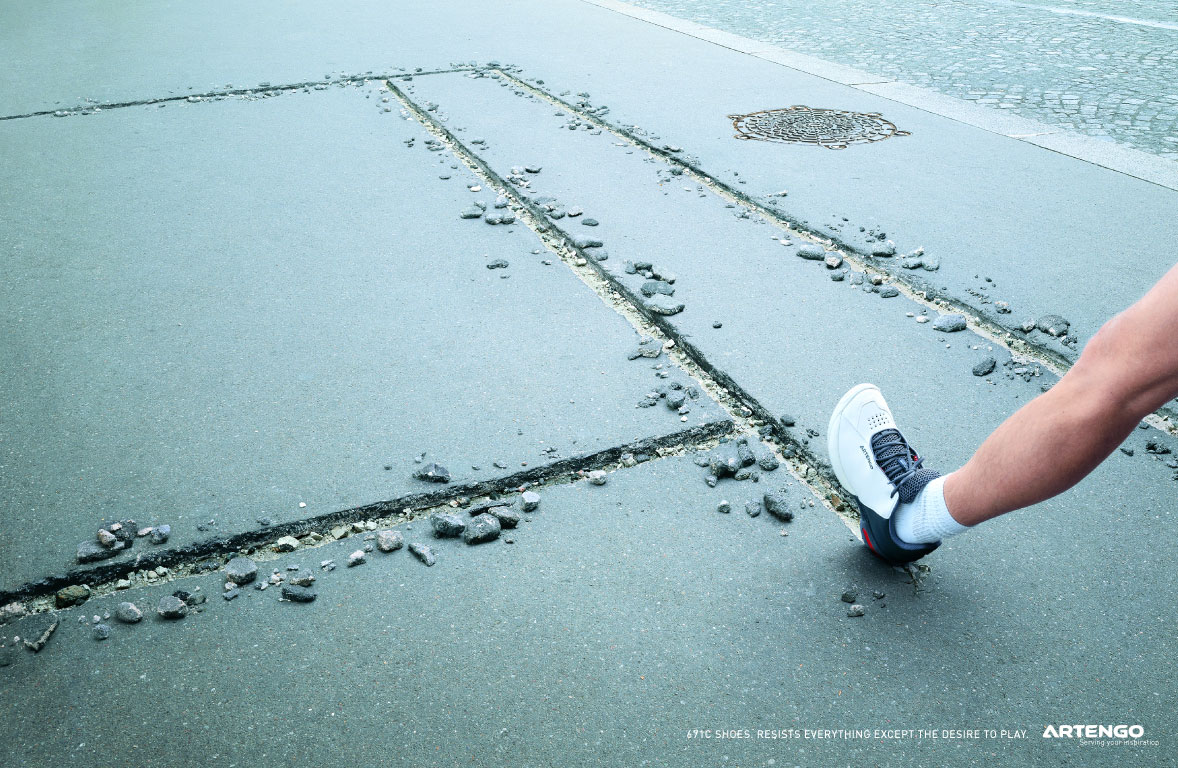 Обувь Artengo ломает асфальт в рекламе от агентства Young & RubicamАгентство Young & Rubicam, создавая рекламу для теннисной обуви Artengo, представляет ее как очень прочную… Настолько прочную, что она может даже ломать асфальт. Кроме того, надевая эту обувь, вы не можете сопротивляться желанию играть в теннис и прочерчиваете теннисное поле прямо на дороге. Надпись: "671С Обувь: Сопротивляется всему кроме желания играть" Агентство : Young & Rubicam, France Творческий директор: Herv? Riffault Арт директор : Guillaume Auboyneau Копирайтер : Pierre-Philippe Sardon Фотограф : Laurence et renaud Loisy |