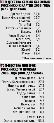 Скоро такая картина в кинотеатрах не будет редкостью. В последние годы сборы российского проката росли как на дрожжах, что давало основание для самых оптимистических прогнозов развития кинобизнеса. Тревожило одно – публикуемые Роскультурой данные кинопосещаемости если и увеличивались, то гораздо медленнее, чем сборы. А это значило, что набухание кассы во многом обусловлено увеличением цен на билеты. К нынешнему году средняя стоимость кинобилета в России достигла европейского уровня, и кассовые показатели резко замедлили свой рост. Это особенно заметно на динамике проката российских фильмов: в 2003 году общий сбор наших картин составил примерно 8 млн. долларов, в 2004 году – 30, в 2005 году – 90, а в 2006-м лишь немного перевалил за 100. При этом десятка лидеров российского проката собрала в уходящем году 89,4 млн. долларов. «Как же так? – может спросить читатель. – Если из 80 российских картин 2006 года 10 лидеров собрали почти 90 млн., а все 80 – чуть больше 100 млн., то на остальные 70 приходится чуть больше 10 млн.?» Именно так и обстоит дело: если расположить все 80 картин по убыванию кассовых сборов и разбить их на десятки, то от десятки к десятке сборы падают в геометрической прогрессии с большим показателем. К примеру, вторая десятка картин собрала около 12 млн., третья – около 3 млн. и т.д. Ту же тенденцию к стагнации показывает число отечественных «миллионеров», т.е. фильмов, собравших в кинопрокате более 1 млн. долларов. В позапрошлом году их было 6, в прошлом – 17, в нынешнем – 18. И, судя по тому, что в настоящее время производится на российских студиях, большого скачка в 2007 году ожидать не следует. Стартующий в самом начале нового года «Волкодав» Николая Лебедева, по оценкам специалистов, соберет неплохую кассу, но не побьет «Дневной дозор». Остается надеяться лишь на прорыв «Обитаемого острова» Федора Бондарчука или какой-нибудь «темной лошадки». Хуже, чем раньше, выглядят позиции российских картин в общем списке проката. Если в прошлом году общий сбор первой десятки лидеров составил 103,2 млн. долларов, из которых на пять отечественных фильмов пришлось 63,4 млн., то в этом году в десятку попали лишь три наших фильма, собравшие 53,8 млн., что составляет только 37% ее общего сбора.