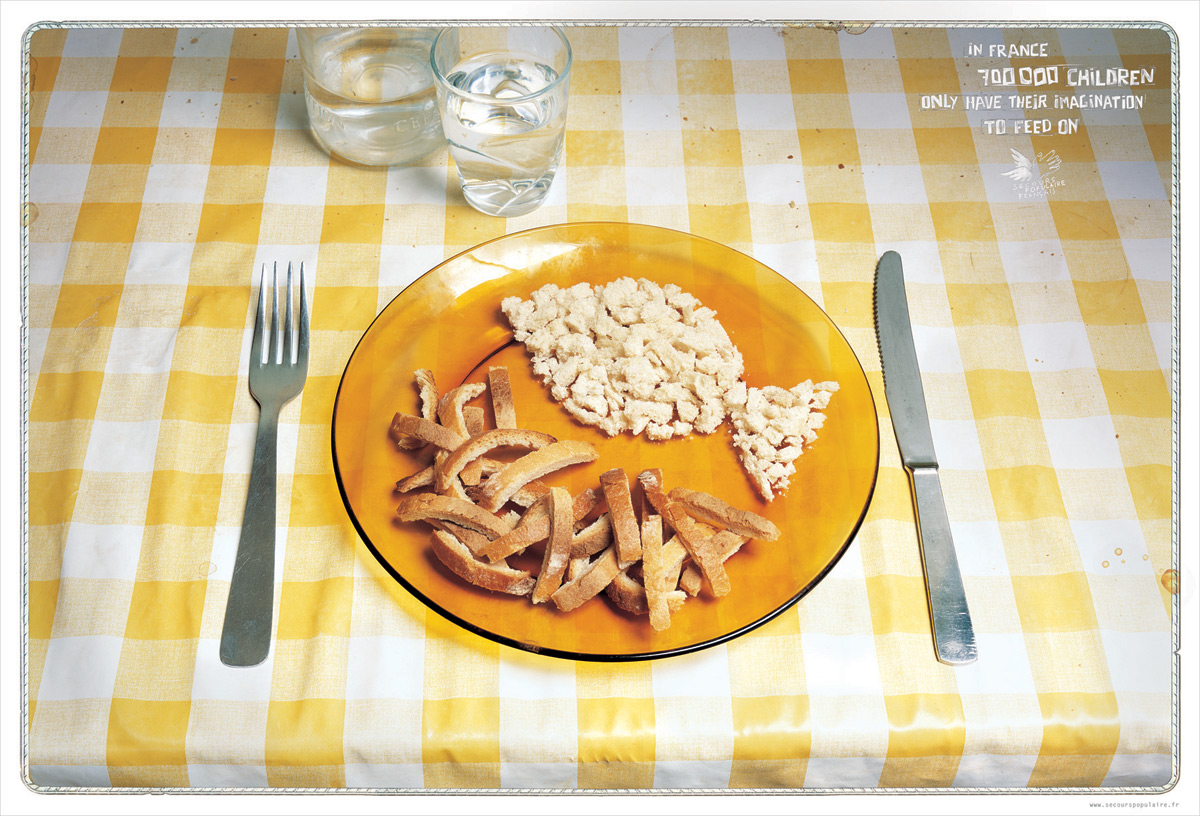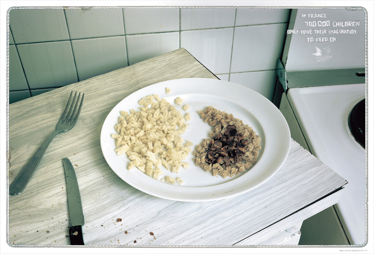 Кушать подано! BDDP & Fils и общество Secours Populaire Fran?ais показало меню голодающих детейАгентство BDDP & Fils по заказу французского общества Secours Populaire Fran?ais создало социальную рекламу, целью которой является обратить внимание на проблему голодающих детей во Франции. Надпись на принтах переводится следующим образом: "Во Франции 700 000 детей едят только в своем воображении", а изображены на принтах тарелки, на которых хлебные крошки сервированы в виде куска мяса и рыбы с гарниром. Агентство: BDDP & Fils Творческий директор: Manoelle Van Der Vareen, Laurent Bodson Арт директор / Копирайтер: Mathieu Degryse, Yves-Eric Deboey Фотограф: Yann Le Pape |