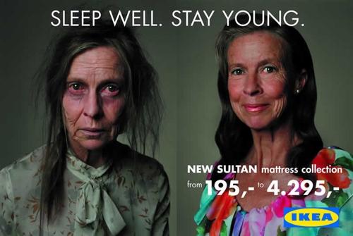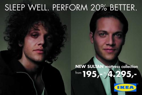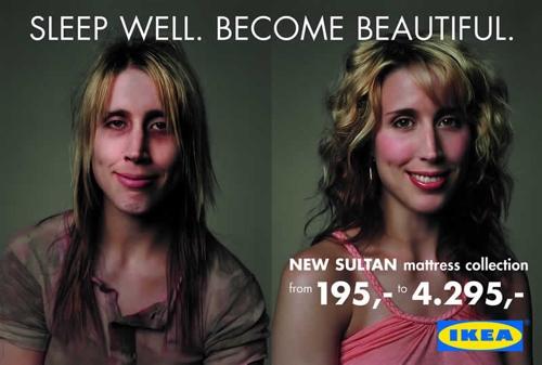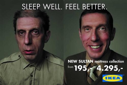 IKEA рассказывает, что нужно делать, чтобы не выглядеть как в фильмах ужасовПеред вами серия рекламных принтов IKEA, рекламирующих коллекцию матрасов New Sultan. На каждом принте размещено две фотографии: до того, как поспал на этих матрасах и после. Картинки "После" выглядят намного лучше. Надписи: "Спишь хорошо. Чувствуешь себя лучше" "Спишь хорошо. Остаешься молодой" "Спишь хорошо. Становишься красивой" "Спишь хорошо. Работаете на 20% эффективнее" ![]() ![]() ![]() ![]() |