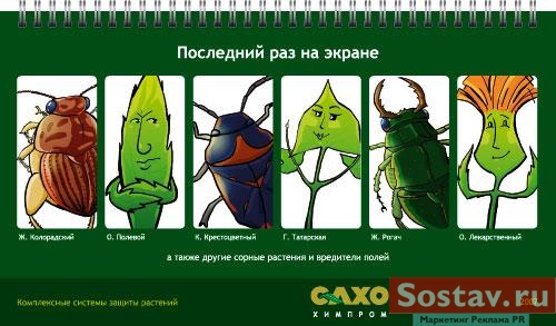 Творческая группа "Тоже люди": документальный календарь для "САХО химпром" о жизни насекомых и растений"САХО химпром" по роду своей деятельности негативно относится к сорным растениям и насекомым-вредителям. Если раньше подобное отношение выражалось только при помощи производства пестицидов, уничтожающих сорняки и вредных насекомых в посевах культурных растений, то в канун нового 2007-го года оно просочилось на страницы корпоративного календаря компании "САХО химпром", созданного творческой группой "Тоже люди". Состав творческой группы: От исполнителя: Эрлих Лена - иллюстрации Ляпунов Алексей - вёрстка От заказчика: Смирнов Павел - идея, копирайт Августинович Ольга - координация проекта ![]() ![]() ![]() ![]() ![]() ![]() ![]() |