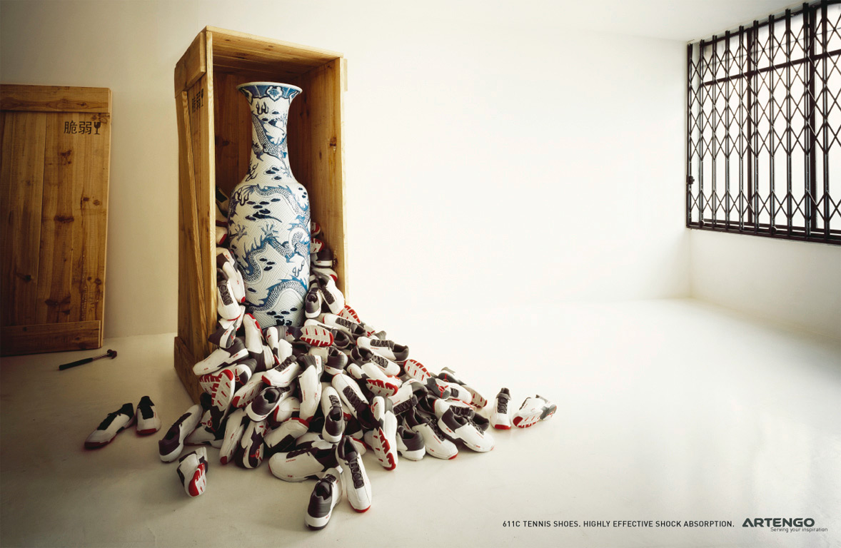 Young & Rubicam перевозит вазы, обложив их обувью Artengo от агентстваКитайские вазы эпохи Минг очень хрупкие, перевозить их можно только обложив теннисной обувью Artengo, считает агентство Young & Rubicam. Эта обувь настолько хорошо поглощает удары, что вазе ничего не угрожает. Надпись: "611 теннисная обувь. Очень эффективное поглощение удара. Агентство: Young & Rubicam, France Творческий директор: Herv? Riffault Арт директор: Guillaume Auboyneau Копирайтер: Pierre-Philippe Sardon Фотограф: Yann Le Pape |