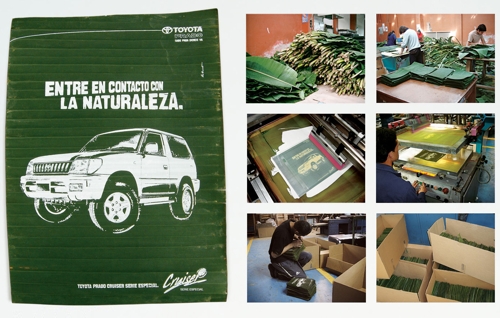 Необычная реклама Toyota Prado от агентства Leo BurnettАгентство Leo Burnett придумало оригинальный способ прорекламировать автомобиль Toyota Prado, а именно специальную серию машин этой марки, направленную на защиту окружающей среды. Рекламные буклеты напечатаны на настоящих банановых листах, а надпись гласит: "Поддерживайте контакт с природой". Агентство: Leo Burnett, Bogota, Colombia Творческий директор: Mauricio Rocha, Rodrigo D?villa Арт директор: Carlos Murad Копирайтер: Otavio Schiavon |
