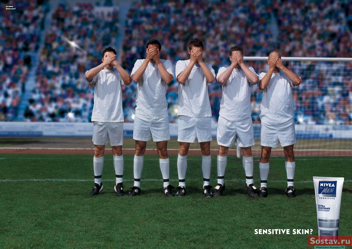 Главная часть тела футболиста - лицо, считают Nivea и Draft FCBЕсли у тебя очень чувствительная кожа, то даже на футбольном поле ты предпочтешь защитить от удара лицо, а не причинное место. Именно так считает агентство Draft FCB, создавшее этот рекламный плакат для лосьона после бритья Nivea for Men Надпись: "Чувствительная кожа?" Агентство: Draft FCB, Germany Творческий директор: Bernd Bender-Asbeck Арт директор: Mark Freiboth Копирайтер: Arne K?nig Фотограф: Moritz Nicolaus Schmid |