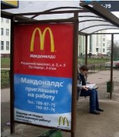 Целью рекламной кампании, является информационная поддержка поиска персонала для постоянно расширяющихся и развивающихся сетей. В качестве рекламоносителей для сети «Макдональдс» были выбраны конструкции сити-формата на павильонах остановок наземного общественного транспорта с периодом размещения с декабря по февраль, в рекрутинговой кампании «АШАН» - бортовая реклама в маршрутных такси 777 маршрута, проходящего по Рублевскому шоссе, также с трехмесячным сроком размещения. ![]() Outdoor.Ru |
