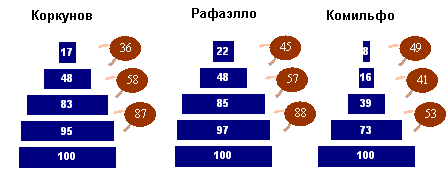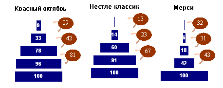 Диагноз от КОМКОНПо итогам опроса, проведенного КОМКОНом по заказу Superbrands International в августе 2006 года. оценившего так называемое здоровье брэнда - соотношение между знанием конкретной марки и лояльностью к ней потребителей, рассмотрим категорию "Шоколадные конфеты". Здесь стоит обратить внимание на следующий факт: самым здоровым брэндом оказалась не старейшая отечественная марка "Красный Октябрь", а молодой "А.Коркунов" и заграничная "Рафаэлло" (компания Fererro Rocher). По степени лояльности "Красный Октябрь" уступает даже новичку рынка - брэнду "Комильфо" Рузской кондитерской фабрики. Вряд ли внушает оптимизм пирамида марки "Нестле Классик" - у нее самый низкий коэффициент конвертации (13%) между предпочтением и лояльностью. А производители Merci могут быть довольны уровнем предпочтения и лояльностью потребителей. Пожалуй, владельцу брэнда компании Storck необходимо сосредоточить свои усилия на большей известности марки и пробудить к ней еще больший интерес. Пирамиды "Здоровье марки"
