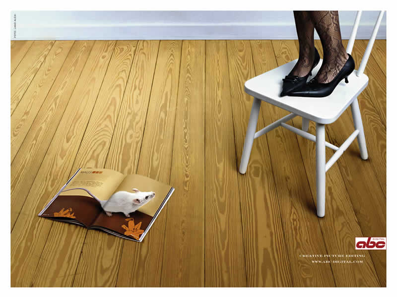 Читатели боятся фотографий. ABC Digital слишком творчески редактирует изображенияВы видите перед собой принты, созданные компанией ABC Digital, занимающейся творческим редактированием изображений. Судя по рекламе, эти принты настолько реальны, что можно всерьез испугаться напечатанной мыши, съесть пиццу, вырезанную из журнала, или влюбиться в женщину с рекламного плаката. Надпись: "ABC Digital. Творческое редактирование изображений. www.abc-digital.com" |