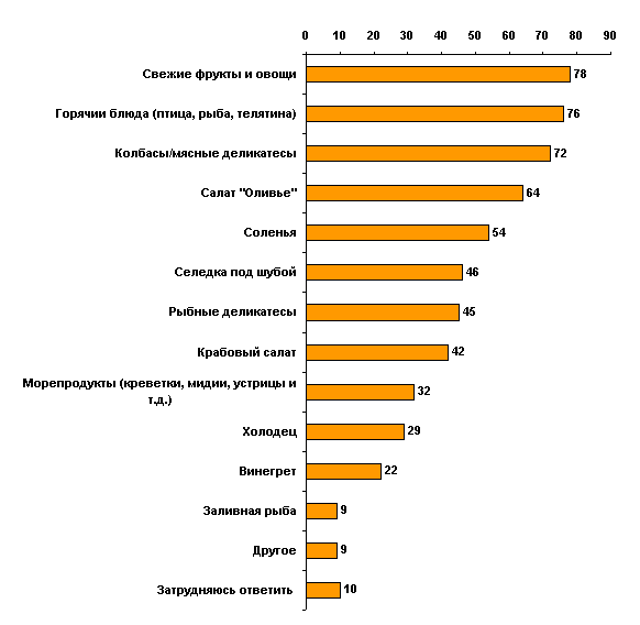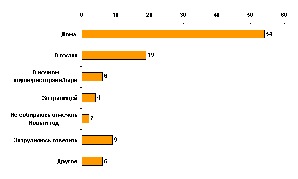 Свыше половины россиян будут встречать Новый год дома с салатом «Оливье» и потратят на подарки свыше 2000 рублейАудитория исследования составила 1648 активных пользователей интернет в возрасте от 14 лет и старше. Выборка репрезентирует Интернет-аудиторию России. Статистическая погрешность не превышает ±2,5%. Россиянам, имеющим доступ к Интернету был задан следующий вопрос: Где вы собираетесь отмечать Новый год? Ответы на него распределились следующим образом (%): ![]() Больше половины россиян (54%) буду встречать Новый год дома. Причем чем старше респонденты, тем чаще такой ответ они давали. Так, среди возрастной категории от 35 до 44 лет дома планируют остаться 70% опрошенных, а среди респондентов старше 45 это цифра составляет 83%. Также значительно чаще, чем в целом по выборке, о своем намерение встретить Новый год дома, заявляли пенсионеры, безработные и домохозяйки (81%). В гости на Новый год отправятся 19% россиян. Особенно сильно желание пойти в гости у студентов и учащихся (28%). В ночном клубе, ресторане или баре буду поднимать бокалы с шампанским 6% россиян. Также у россиян поинтересовались: Какие блюда будут стоят на праздничном столе? Ответы распределились следующим образом (возможно несколько вариантов ответа): ![]() Фаворитами праздничного стола стали свежие фрукты и овощи (78%) и горячие блюда из птицы, рыбы и телятины (76%). Весьма популярны у россиян колбасы и различные мясные деликатесы (72%). Традиционный салат «Оливье» будет стоять на столах 64% россиян, соленья – 54%, селедка под шубой - 46%. Чаще, чем в целом по выборке сельдь под шубой готовят хозяйки Приволжского (61%) и Сибирского (56%) округов, а наиболее редко – в московских семьях (40%). Заливной рыбой, ставшей новогодним блюдом благодаря фильму Эльдара Рязанова, порадуют себя и своих близкий 9% граждан страны. Респондентам был задан вопрос: Сколько вы собираетесь потратить на подарки на Новый год? Ответы на него распределились следующим образом: ![]() 43% россиян готовы потратить на подарки для своих близких от 2000 до 5000 рублей. Каждый пятый россиянин выделяет на новогодние подарки из семейного бюджета от 5000 до 10000 рублей. Каждый седьмой житель страны запланировал потратить от 1000 до 2000 рублей. www.rmh.ru |