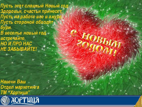 Поздравления от компании "Хортица"Дорогие друзья! Новый год - это самый долгожданный и по-семейному добрый праздник, с которым все связывают свои самые заветные мечты. Пусть Новый год будет для Вас щедрым и обильным, сердечным и радостным. Пусть Вам всегда сопутствуют удача и успех во всех начинаниях в Новом году! А коллегам по алкоцеху хочется пожелать новых идей, высокой прибыли и абсолютного качества продукции. ![]() |