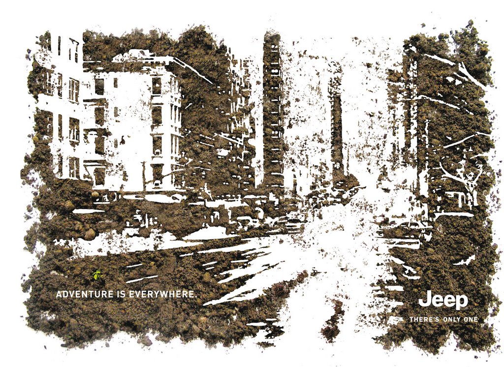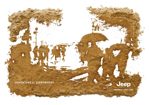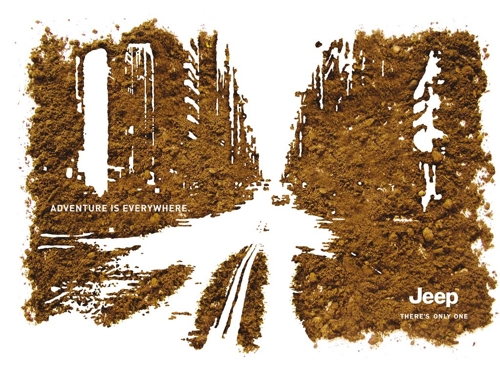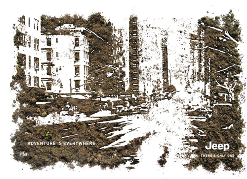 Не надо грязи! Реклама внедорожников JeepПо бездорожью непринужденно. Грязные, обрызганные улицы на постерах, являются подтверждением того, что автомобилям Jeep, все не почем. Городские улицы на принтах нарисованы такими материалами, в которых автомобилю легко завязнуть: песок, земля или грязь. Основная идея в том, что Jeep по бездорожью ездит также легко, как и по городским улицам. Слоган: "Приключения повсюду. Jeep. Он один такой" |