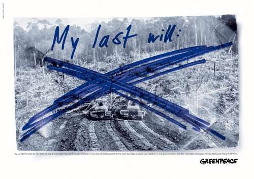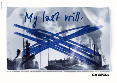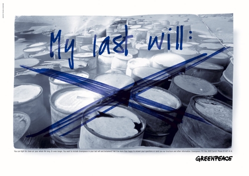 Последнее желание GreenpeaceА о чем Вы подумали бы перед смертью? Этот вопрос стал темой для сюжета рекламных принтов . Примером последнего желания сторонников общественной организации по защите природы Greenpeace, по мнению агентства Y&R, могло бы быть, например: закрытие заводов, загрязняющих воздух, запрещение вырубки лесов. Надпись на постере: "Мое последнее желание: " Состав творческой группы: Агентство: Y&R, Switzerland |