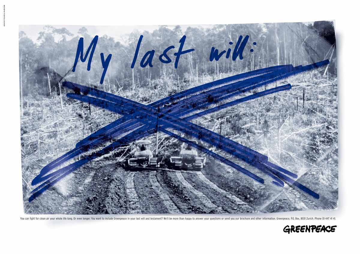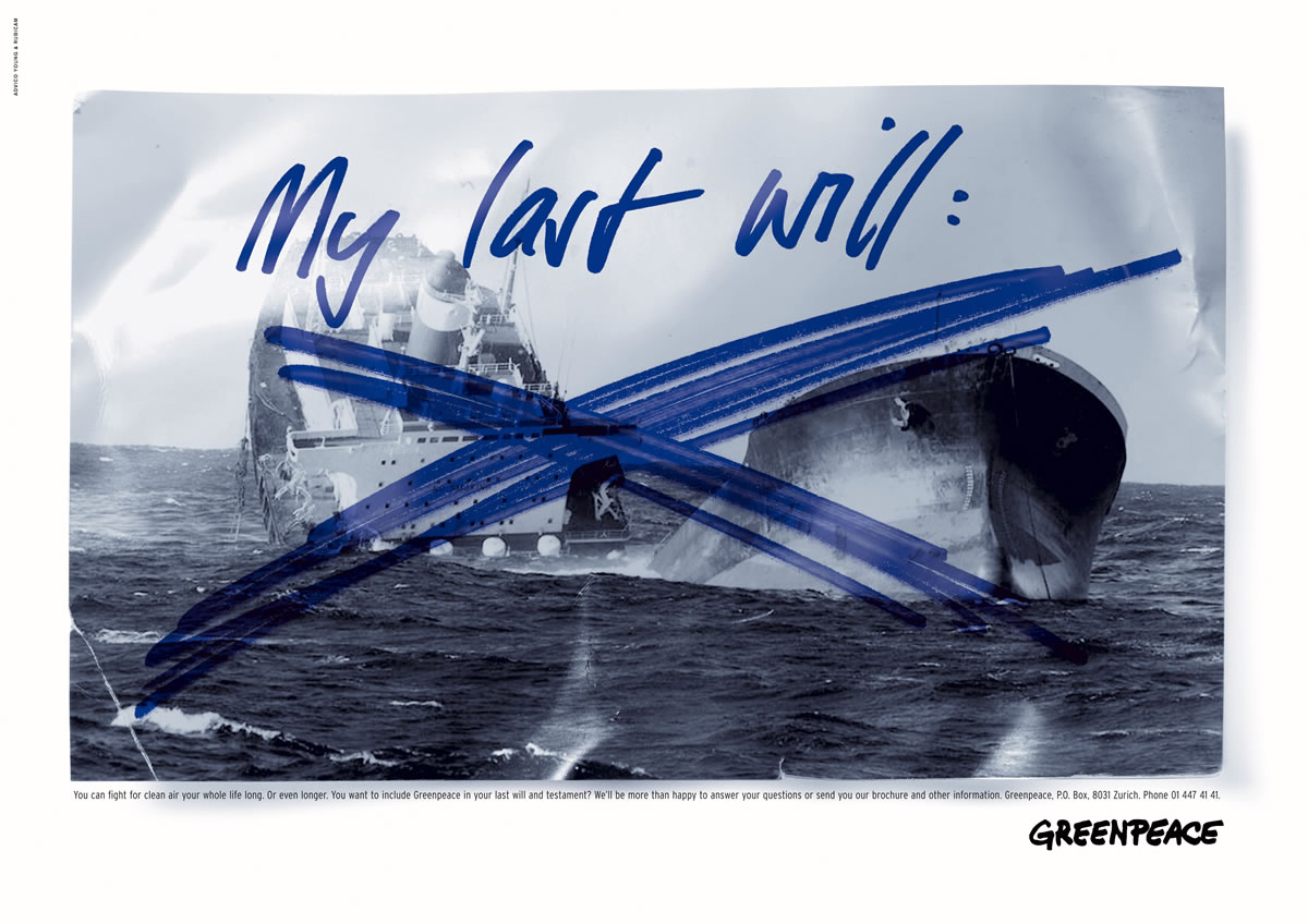 Последнее желание GreenpeaceА о чем Вы подумали бы перед смертью? Этот вопрос стал темой для сюжета рекламных принтов . Примером последнего желания сторонников общественной организации по защите природы Greenpeace, по мнению агентства Y&R, могло бы быть, например: закрытие заводов, загрязняющих воздух, запрещение вырубки лесов. Надпись на постере: "Мое последнее желание: " Состав творческой группы: Агентство: Y&R, Switzerland |