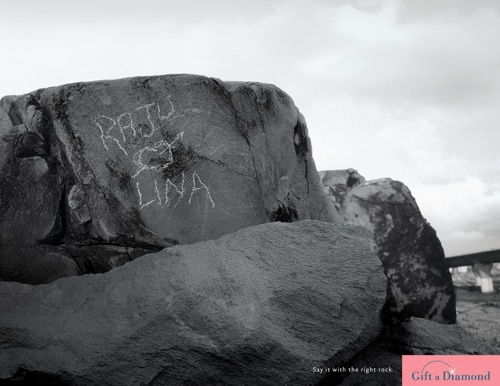 Реклама ювелирного магазина от агентства JWT IndiaПодари любимой настоящий камень. Поместив на постер фото стандартного признания в любви на сером, они противопоставили его признанию с брильянтом от магазина Gift a Diamond. Надпись на принте: "Ражу любит Лину. Скажи это с правильным камнем. Подари алмаз". Состав творческой группы: Агентство: JWT, India Главный творческий директор : Agnello Dias Творческий директор: Nandita Chalam, Dipesh Kowarkar Арт директор: Dipesh Kowarkar Копирайтер: Nandita Chalam Фотограф : Makarand Shiraskar Иллюстратор : Deepak Jadhav |