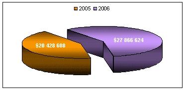 Если сравнивать 2005 и 2006 года, в диаграмме 2 видно, что в 2005 году сохранялся стабильный рост с января по сентябрь, незначительное понижение бюджета было зафиксировано в июле. В 2006 году понижение бюджета зафиксировано в феврале, после чего шел стабильный рост до июля, в августе и сентябре расходы на размещение рекламы, в наружной рекламе также снизились.