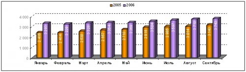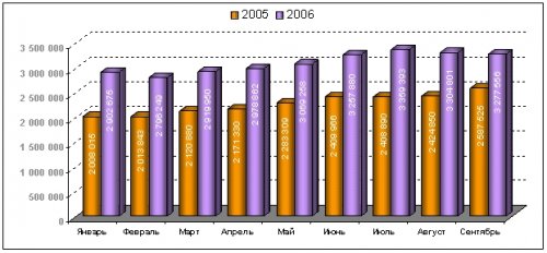 Диаграмма 2 - Сравнительная динамика изменений рекламных бюджетов по месяцам, за 9 месяцев январь - сентябрь 2005, 2006 гг. Примечание: расходы на размещение наружной рекламы приводятся в соответствии с официальными прайс-листами, без учета скидок и льгот.