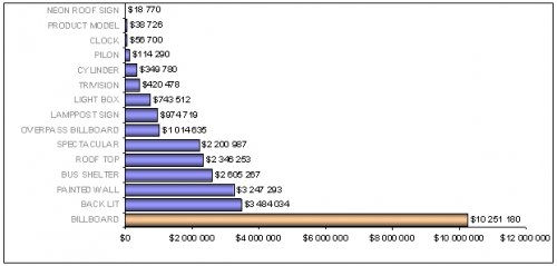 Расходы на рекламу десяти крупнейших по бюджету рекламодателей наружной рекламы за январь-сентябрь 2006 год составили 8,2 млн. USD - 29,35% от общего бюджета.