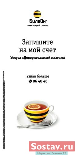 Нет денег? Beeline за вас заплатит. Новый ролик BBDO MoscowBBDO Moscow воплотило в рекламном ролике новую услугу "Билайна" - "Доверительный платеж". Теперь, если у верного своему оператору абонента вдруг закончатся деньги на телефоне, то Beeline пополнит баланс за свой счет, абоненту лишь останется вернуть "долг" в течение трех дней. Рекламная компания будет проходить на федеральных телевизионных каналах и в outdoor.