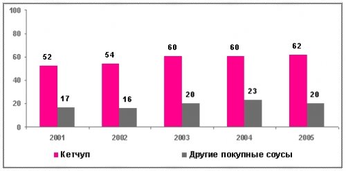 Диаграмма 1 - Потребление кетчупа и других покупных соусов. Динамика 2001-2005 гг. % В какой бы стране мира ни готовилась вкусная и здоровая пища, без соуса ей не обойтись. С соусом она становится ароматнее, сильнее возбуждает аппетит. Производители предлагают широкий выбор видов соуса, благодаря чему потребители получают возможность приготовить в домашних условиях изысканные блюда. По данным MMI, на протяжении последних 5 лет томатный соус2 является лидером в потреблении (см.Таблицу 1). Таблица 1 - Предпочтения по видам соусов. Динамика 2001-2005 гг. %