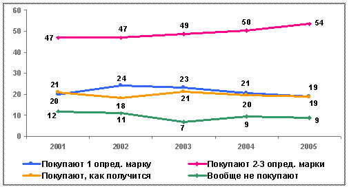 При покупке кетчупа и соусов потребители, в основном, ориентируются на 2-3 определенные марки, причем таких потребителей к 2005 году стало больше, и они составили 54%. Число потребителей с устойчивой ориентацией (тех, кто покупает всегда только одну марку), наоборот, с каждым годом уменьшается, так, если в 2002 году их было 24%, то в 2005 - стало 19%. Самой интересной группой потребителей можно считать тех, кто покупает марки, как получится, так как внимание таких потребителей можно переключить на новую марку. Видимо, производителям это хорошо удается, потому что число неустойчивых потребителей к 2005 году сократилось и составило 19%. Диаграмма 2 - Ориентации при покупке кетчупа и соусов на количество марок. Динамика 2001-2005 гг. % Казахстанский рынок изобилует количеством марок кетчупов, как отечественного, так и импортного производства. На протяжении 5 последних лет российская марка "Балтимор" возглавляет тройку лидеров по потреблению. Казахстанская марка "Арома", находясь на второй позиции в 2001-2003 гг., в 2004-2005 гг. перешла на третье место, уступив позиции марке "3 желания", которая неплохо набирает обороты, налицо явная тенденция к росту числа потребителей (см.Таблицу 3). Таблица 3 - Потребление марок кетчупа . ТОР-3 (за 2005 г.). Динамика 2001-2005 гг. %