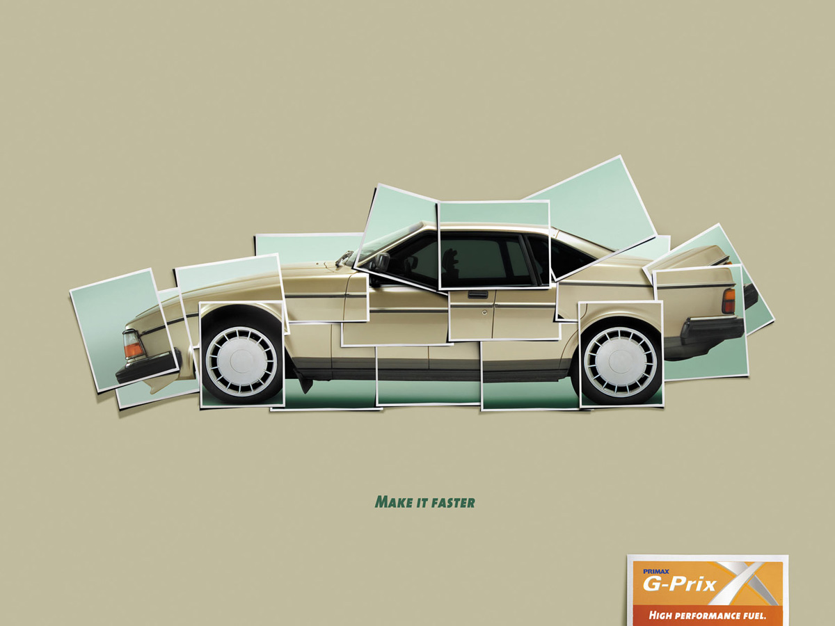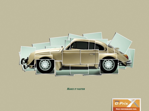 Сделай это быстрее! Реклама топлива Primax G-PRIX от агентства Pragma DDBАгентство Pragma DDB разработало рекламу для топлива Primax G-PRIX. На принтах, которые вы видите перед собой, из отдельных фрагментов и не очень аккуратно составлены старые автомобили Volkswagen и Volvo. Основная идея этой кампании заключается в том, что топливо G-PRIX - это высокоэффективное топливо и, следовательно, увеличивает мощность и скорость автомобиля. Надпись: "Сделай это быстро" "Primax G-PRIX топливо высокой эффективности" Состав творческой группы Агентство: Pragma DDB, Lima, Peru Арт дирекор: Alvaro Naddeo Копирайтер: Jaime Chehade Творческий директор: Ricardo Chadwick Иллюстратор, Фотограф и другое: Carlos Luna |