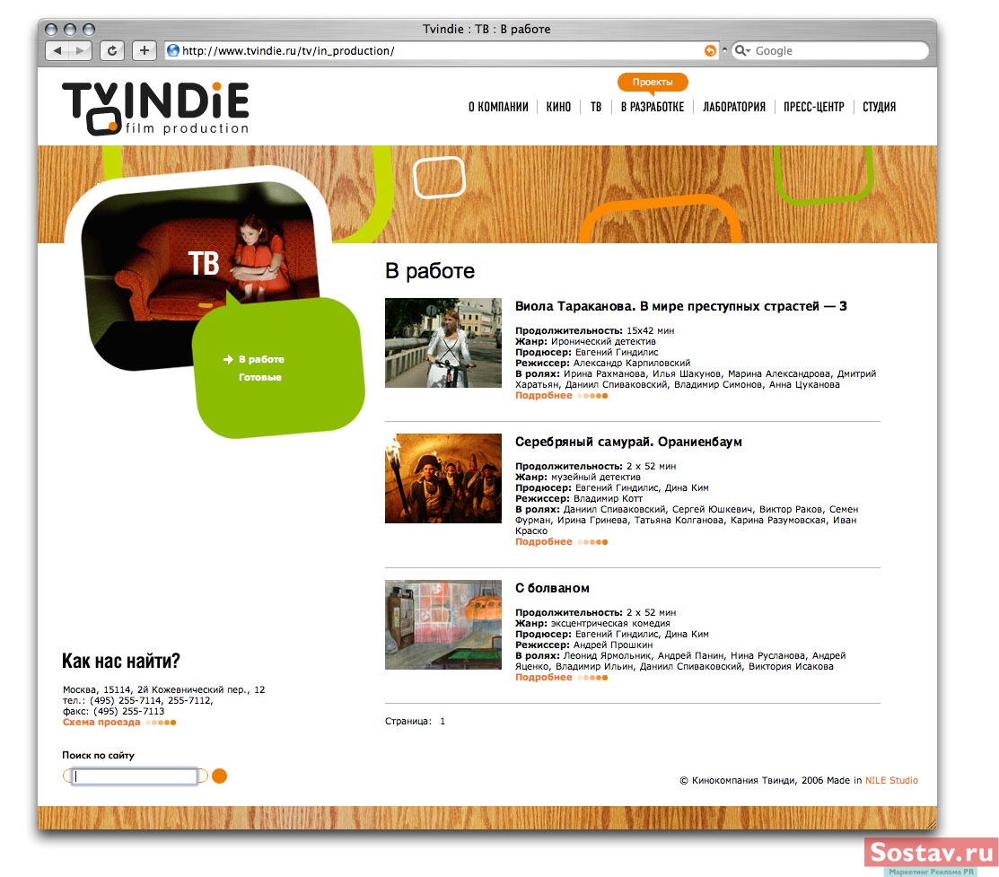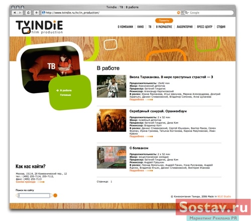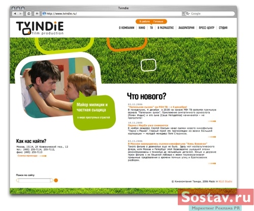 Nile Studio представила сайт кинокомпании TvindieВ конце 2006 года кинокомпания Tvindie выпустила в Интернет-прокат собственный сайт, разработанный в Nile Studio. И зрители, и пресса, и профессионалы от кино и телевидения найдут на сайте полезную для себя информацию. В специальном разделе "Лаборатория" доступны интересные подробности о сценаристах, операторах, художниках и даже актерах занятых в лентах производства Tvindie. Кинокомпания Tvindie была создана для производства художенственных кино- и телефильмов. Ее работы отличаются хорошим стилем и добрым юмором. Сериалы, которые снимает Tvindie, можно увидеть на каналах REN ТV, СТС, ОРТ и других. Состав творческой группы Юра Алексеев Владимир Жидков Евгений Поздняков Екатерина Гершензон |