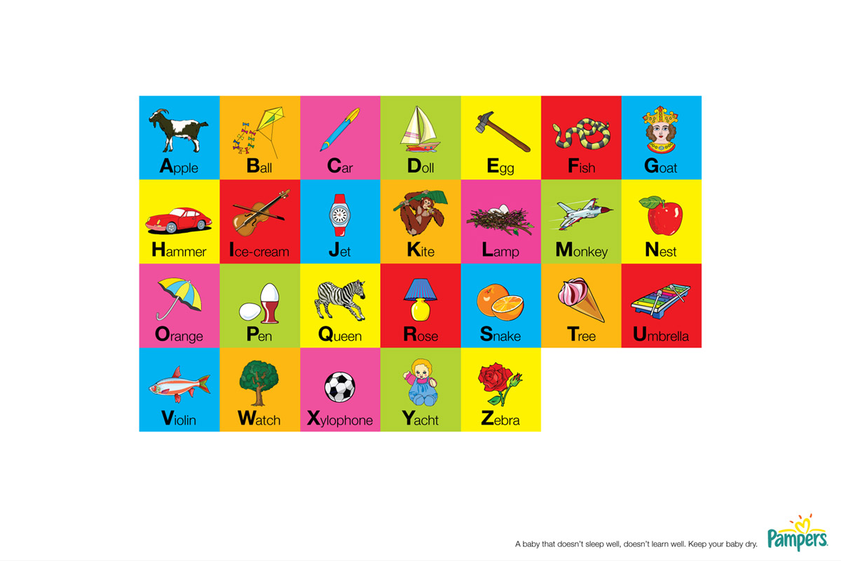 Глупые дети от агентства Saatchi & Saatchi Dubai для PampersАгентство Saatchi & Saatchi и компания Pampers считают, что подгузники могут серьезно повлиять на развитие умственных способностей у маленьких детей. Так, например, ребенок, который плохо спит по ночам, может полностью перепутать алфавит. Надпись: "Ребенок, который плохо спит, не может хорошо учиться. Поддерживайте своего ребенка сухим. Pampers" Агентство: Saatchi & Saatchi, Dubai |