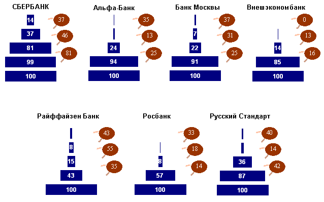 Диагноз от КОМКОН: банки МосквыКак свидетельствуют результаты опроса, наибольшей известностью у москвичей пользуется Сбербанк (максимальный показатель осведомленности о брэнде - 99% от всех опрошенных). Далее идут Альфа-Банк (94%) и Банк Москвы (91%). Следующая группа - Русский Стандарт (87%) и Внешэкономбанк (85%). Наконец, заметно отстают от них Росбанк (57%) и Райффайзенбанк (43%). На следующей ступени - знакомство с брэндом - наиболее прочные позиции опять у Сбербанка. Эта кредитная организация хорошо известна 81% всех москвичей. Соответственно, у Сбербанка будет и самым высоким коэффициент конвертации - 81% (он рассчитывается как процент от предыдущего показателя и указан сбоку между платформами). У Русского Стандарта коэффициент конвертации равен 42%, затем идет Райффайзенбанк (35%). Одинаковый коэффициент конвертации (25%) у Альфа-Банка и Банка Москвы. Затем идет Внешэкономбанк (16%), а замыкает список Росбанк (14%). О чем говорят эти данные? В первую очередь о том, что известность отнюдь не тождественна хорошему знанию брэнда. Хотя Русский Стандарт меньше известен москвичам, те, кто слышал об этом банке, знают о нем довольно много. Знания москвичей об Альфа-Банке менее значимы. Следующая ступень - предпочтения. В очередной раз неоспоримое лидерство у Сбербанка в абсолютных значениях. Его услугами предпочтут воспользоваться 37% москвичей. Высок у Сбербанка и коэффициент конвертации на этой ступени - 46%. То есть, почти половина тех, кто уже хорошо знает Сбербанк, предпочтут обратиться именно в эту финансовую организацию. Однако тут Сбербанк уже уступает пальму первенства Райффайзенбанку: у него аналогичный коэффициент конвертации значительно выше - 55%. То есть, у российского подразделения австрийского банка гораздо более преданные поклонники, чем у отечественного банка с более чем вековой историей. У других брэндов показатели более скромные. Последняя ступень демонстрирует соотношение между предпочтением и лояльностью. И здесь по коэффициенту конвертации Сбербанк уже опережают несколько брэндов. На первом месте вновь Райффайзенбанк (43%), на втором - Русский Стандарт (40%). С показателем 37% Сбербанк делит третье место с Банком Москвы. Ненамного от них отстали Альфа-Банк и Росбанк. Правда, есть и очевидный аутсайдер - число лояльных Внешэкономбанку потребителей крайне мало и не достигает даже 1%. Какие из этого можно сделать выводы? Безусловно, в силу исторических обстоятельств Сбербанк сегодня является самым популярным банковским брэндом, отсюда и все его преимущества перед конкурентами. Но вот по здоровью марки он все-таки уступает Райффайзенбанку. Можно предположить, что если бы маркетологи Райффайзенбанка предприняли ряд усилий, чтобы повысить знание брэнда среди москвичей, то вслед за этим заметно возросло бы число симпатизирующих этой марке, предпочитающих ее другим и, главное, называющих ее своей самой любимой маркой. В целом же основной недостаток негосударственных банков заключается, пожалуй, в невысокой степени клиентского предпочтения их брэндов. Об этом свидетельствует уже сам вид получившихся пирамид. Третья платформа - самая узкая, нарушающая общую гармонию. Пирамиды "Здоровье марки" ![]() ![]() - часть 1