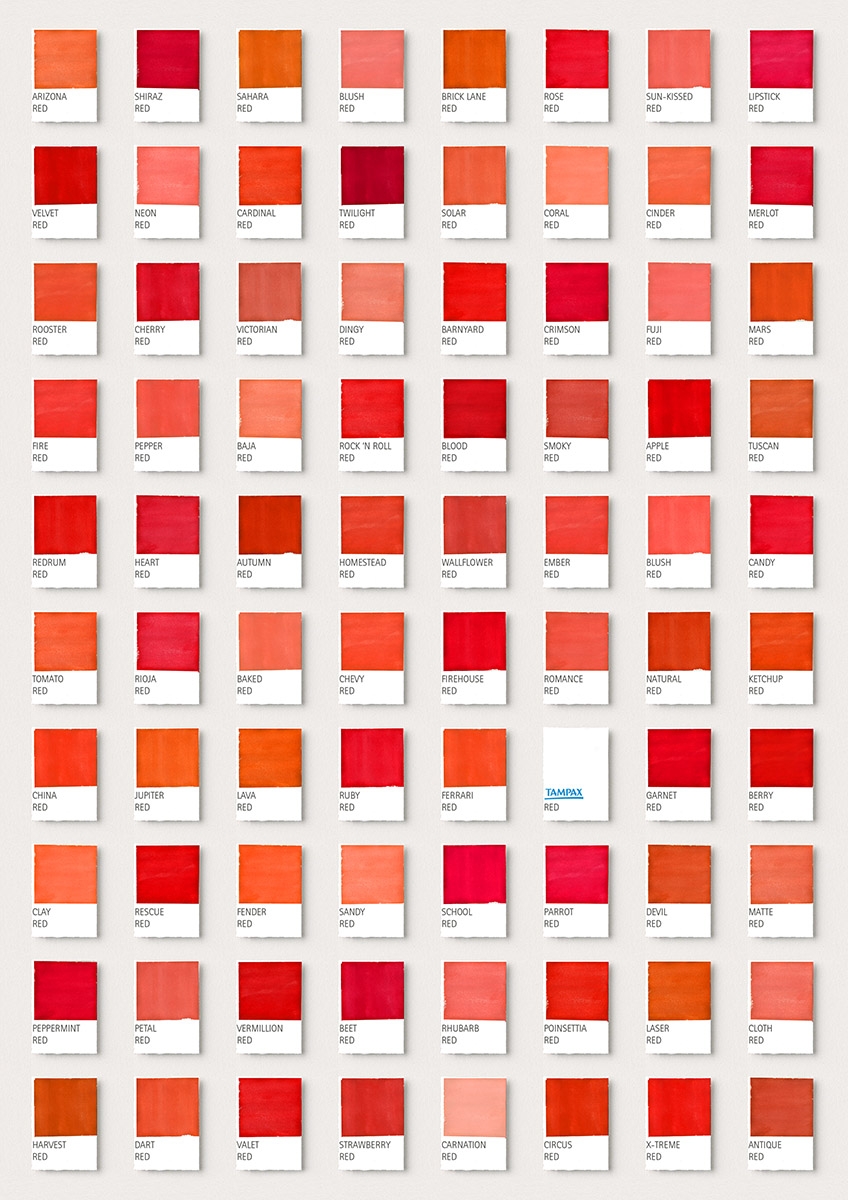 Градации красного для рекламы Tampax от Miami Ad SchoolУченики дизайнерской школы Miami Ad School в США создали этот шедевр для рекламы тампонов Tampax. Им пришлось долго ломать голову, чтобы придумать столько названий красного цвета, ну а красный цвет в видении Tampax становится белым. Инструктор: Diego Cantu Арт директор: Croix Gagnon Копирайтер: Ian Hart Miami Ad School, Miami, USA |