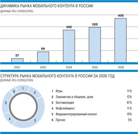 Рынок мобильного контента в России вырос в прошлом году на 25%, до $408 млн – такие данные привела вчера компания iKS-Consulting. Продажи мобильных развлечений оказались значительно ниже, чем предсказывали эксперты. Аналитики считают, что поставщики контента не выдерживают конкуренции с интернетом, позволяющим качать медиаприложения быстрее и дешевле, чем через сотовые сети.