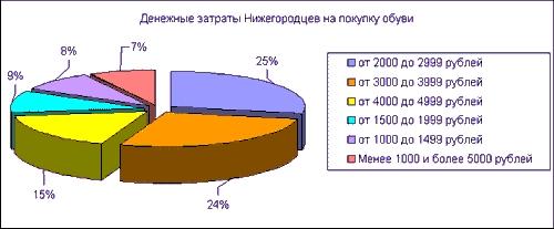 При последней покупке обуви 25% респондентов потратили от 2000 до 2999 рублей, 24% - от 3000 до 3999 рублей, 15% - от 4000 до 4999 рублей, 9% - от 1500 до 1999 рублей, 8% - от 1000 до 1499 рублей. Менее 1000 и более 5000 рублей при последней покупке обуви потратили по 7% опрошенных нижегородцев. В среднем, покупка пары обуви обошлась жителям Нижнего Новгорода в 2654 рублей.