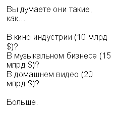 Рыночная стоимость игорного бизнеса больше 25 млрд дол. Пока другие развлекательные индустрии уменьшаются, PricewaterhouseCoopers предвещает, что игровой бизнес достигнет 54.6 млрд дол за следующие несколько лет. Эти цифры, конечно, ошеломляющие, особенно если принять во внимание, что отрасль только зародилась. Если вас всё же это не впечатляет, пойдём дальше. Начнём с Sony, одной из самых крупных компаний в мире в области домашних развлечений и музыки. Sony производит ноутбуки, цифровые камеры, MP3, аудиоплееры, мобильные телефоны и игровые приставки. Из всех представленных направлений именно приставки являются наиболее прибыльными. И самым удивительным фактом является то, что компания получает от этого продукта денег столько же, сколько от всех других вместе взятых. А теперь давайте сравним игровой бизнес с киноиндустрией и Голливудом. Наибольший кассовый сбор в истории кинопроизводства принёс "Человек-паук 2" в размере 40.4 млн дол за первый день проката. В то время как Halo 2 (первая игра-"стрелялка") - 100 млн дол. Сводя эти данные в простую таблицу, понятно, что игровой бизнес обошёл киноиндустрию в 2.5 раза. Игры сейчас занимают больше пространства, чем музыка, фильмы и видео. На данный момент они являются королями развлечений. И это только начало. ![]() Популярность таких известных личностей, как Леонардо ди Каприо, Джулия Робертс, Мадонна и Колд Плэй падает, а их место занимают виртуальные герои Лара Крофт и Симсы. Игровая индустрия сейчас на пике популярности и переживает исключительный рост, невиданный ещё в мире развлечений. В скором будущем, игроки и создатели станут новыми кино героями, режиссёрами и вообще основными законодателями всемирной индустрии развлечений.