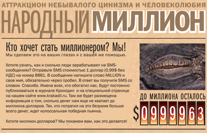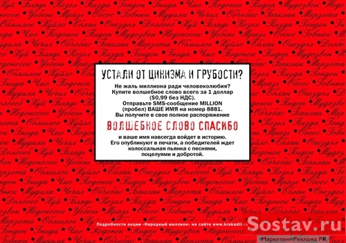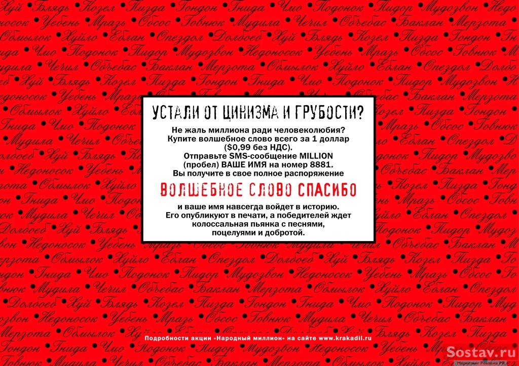 Гуманитарная помощь за доллар. "Крокодил" продает слово "спасибо"Как стало известно Sostav.ru, журнал "Крокодил" запустил промо-акцию под названием "Народный миллион", согласно которой нужно отправить SMS-сообщение стоимостью один доллар на указанный номер со словом "million" и в ответ получить "спасибо". "Кто хочет стать миллионером? - спрашивают на веб-странице сатирического издания, тут же отвечая сами себе, - МЫ!". Началом акции стало вирусное сообщение: изображение с надписью "Устали от цинизма и грубости…" на красном фоне, где "каллиграфическим" шрифтом напечатан конгломерат бранных слов. Увидев картинку, Sostav.ru обратился за комментариями к генеральному директору журнала "Крокодил" Валерии Селивановой: "Как правило все SMS-проекты, знакомства по телефону, скачивание мелодий, игры рассчитаны на молодую аудиторию. Мы же попробовали с помощью нашей акции "Миллион" заинтересовать тех людей, которые никогда этим не пользовались. Поэтому нам казалось, что просто необходимо сразу честно признаться, что мы хотим заработать на этом деньги и предлагаем всем включится в этот проект, не разыгрывая призов, как это делают в глянцевых журналах и тому подобное. Конечно, главным поводом стало желание зацепить людей, чтобы они почувствовали наши эмоции: мы действительно устали от грубости, поэтому решили демонстративно продавать волшебное слово "Спасибо". В редакции эту кампанию еще окрестили "гуманитарной помощью" населению мегаполиса, уставшему о грубости. По условиям акции, те, кто купил волшебное слово "спасибо", будут запечатлены, если не страницах истории, то на страницах журнала точно. Как утверждает Валерия, имена всех участников и их сообщения регулярно появляются на Интернет-сайте и в печатном варианте. На вопрос, как долго будет длиться проект, в "Крокодиле" ответили, что определенных сроков нет, а продолжительность SMS-кампании будет полностью зависеть от ее популярности. Интересно, что благородная мотивация, а именно "внедрить вежливость в массы", должна закончится попойкой: победителям сулят "колоссальную пьянку". Марина Золотая, Sostav.ru |