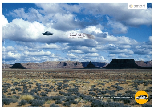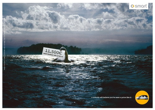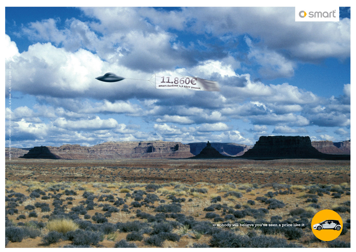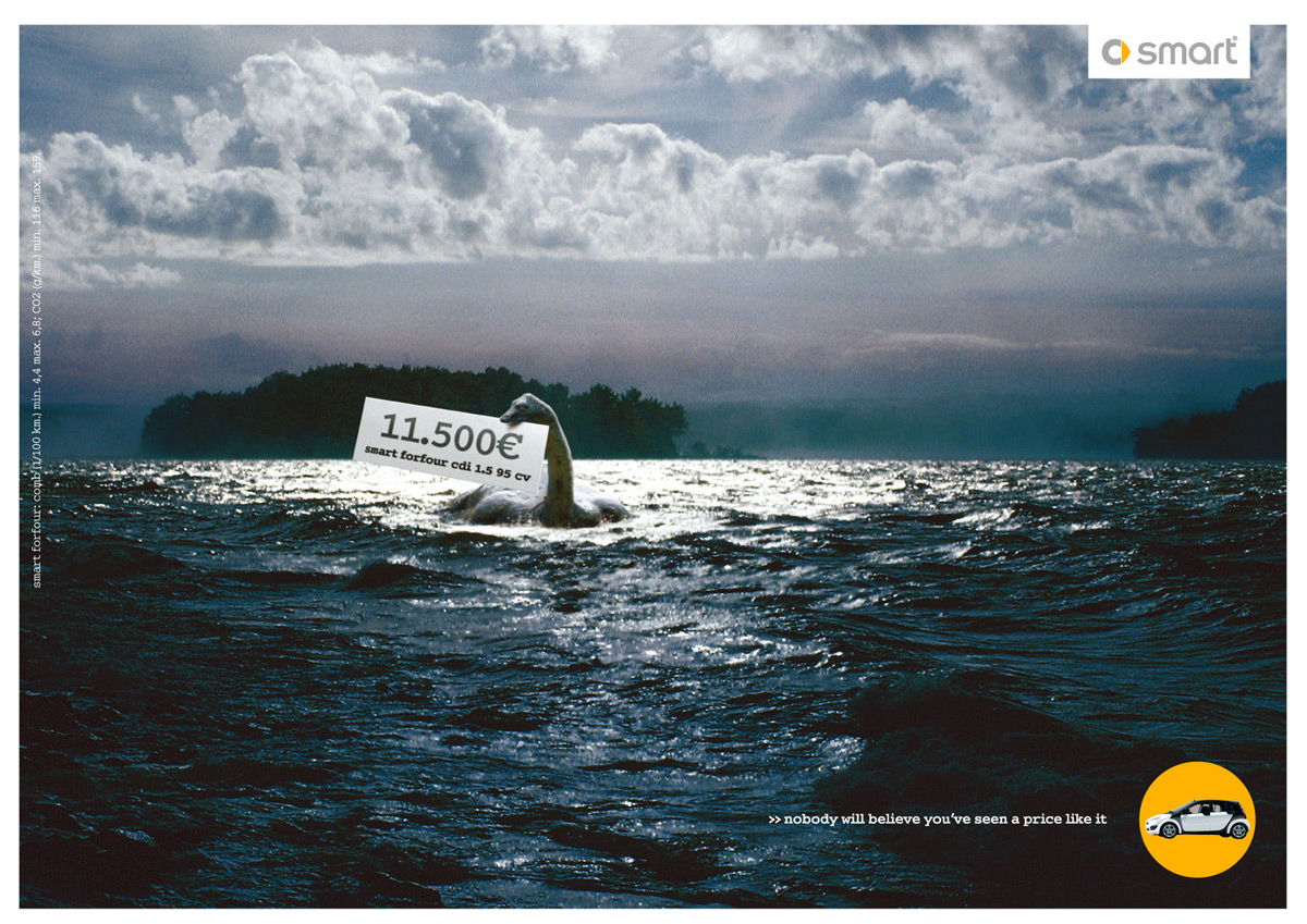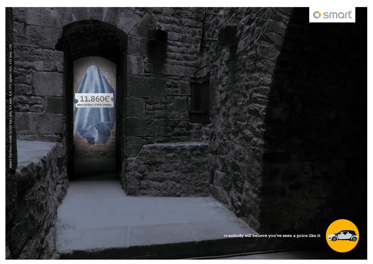 Агентство Contrapunto для автомобиля Smart for four: Вам никто не поверит!Испанское агентство Contrapunto разработало масштабную рекламную кампанию для автомобиля Smart for four. Она состоит из трех принтов и трех роликов. В них представлены вещи, в которые сложно поверить, например, приведение, летающая тарелка, Лохнесское чудовище, снежный человек. Однако самым важным звеном является табличка с ценой на автомобиль Smart. Она настолько низкая, что в это невозможно поверить. Надпись: "Никто не поверит вам, что вы видели такую цену" Агентство: Contrapunto, Madrid, Spain Творческий директор: Antonio Montero, Jose Maria Cornejo, Fernando Galindo Арт диектор: Fernando Zurita Копирайтер: Alberto Lizaralde |