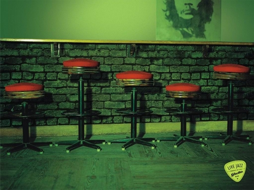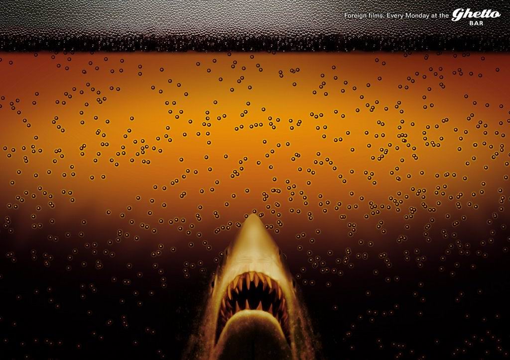 Индийское агентство Percept H таким образом рекламирует Ghetto bar, в котором каждый понедельник показывают иностранные фильмы, а каждый вечер в нем играют джаз.