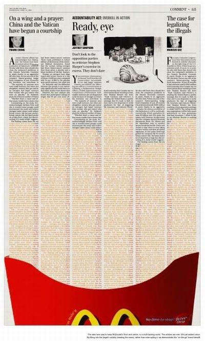 Так рекламируют MCDonald's в прессе в разных концах светаВ Швеции агентство DDB, разместившее рекламу этого фаст-фуда, рядом с объявлениями по продаже недвижимости, рекомендует не принимать важные решения на пустой желудок. А в Канаде агентство Cossete Atlantic "внедрило" картофель-фри и чизбургер в газетные полосы. Получилось интересно. ![]() ![]() ![]() ![]() |
