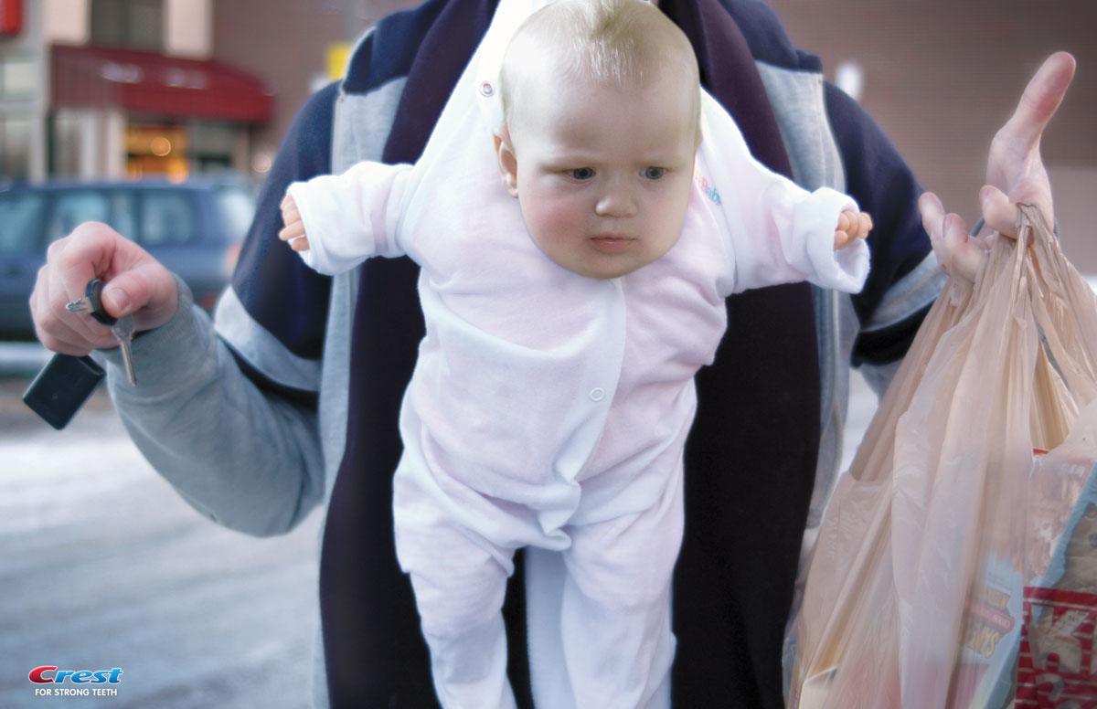 Удачная студенческая реклама зубной пасты CrestЧто делать, когда вам надо открыть машину, а вы держите на руках ребенка? Или нужно взять кубок, а руки заняты? Ответ на этот вопрос нам предлагают студенты из колорадского университета University of Colorado at Boulder, которые создали эти рекламные плакаты для зубной пасты Crest. Если руки заняты, то можно использовать зубы, но только если они сильные благодаря зубной пасте Crest. Надпись: "Crest. Для сильных зубов." Творческий директор (Профессор): Jonathan Schoenberg Арт директор (Студенты): Will Geddes, Tony Cozzolino University of Colorado at Boulder |