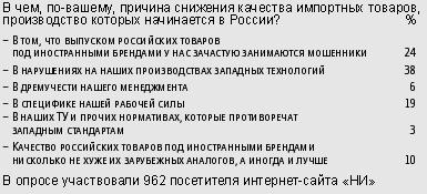 Сделано в России. Товары под иностранными марками, производимые в нашей стране, резко теряют в качествеВчера стало известно о том, что в Самаре по канадской лицензии будет выпускаться турбовинтовой самолет Bombardier Q300. Этот лайнер пополнит длинный ряд иностранных брендов, выпускаемых в РФ. Общее их число перевалило в прошлом году за 1,5 тыс. Российские «иномарки» – это не только автомобили, но и пиво, сигареты, сотни наименований продуктов питания, косметика.Да что ни возьми – везде более или менее известное иностранное название. Однако, после того как та или иная марка начинает производиться в России, качество ее меняется нередко не в лучшую сторону. Производители и дистрибьюторы уверяют, что это не так. Независимые эксперты признают: проблема есть. Кто виноват, выясняли «Новые Известия». Иностранные по названию, но российские по сути товары появились в нашей стране в середине 90-х годов. Однако те, кто думает, что рынок уже занят, заблуждаются. Каждый год появляются сотни новых марок, к которым на Западе давно привыкли, а в России и слыхом не слыхивали. В Роспатенте «НИ» сообщили, что только в 2006 году договор на пользование товарным знаком с иностранными лицензиарами (то есть с владельцами бренда) заключили 1652 российские компании. В 2005 году таких договоров было 948, в 2004-м – 1134, а в 2003-м – 803. Насколько все эти копии похожи на оригиналы? Председатель Союза потребителей РФ Петр Шелищ заверил «НИ», что, «согласно закону о товарных знаках производитель несет ответственность за продукцию и за соответствие тем требованиям, которые он сам предъявляет своей продукции». «Правда, никакой нормы ответственности не установлено, – признает эксперт, – ни имущественной, ни административной. Об уголовной я даже не говорю». Иными словами, за то, что качество оригинала и нашей «копии» находится порой на разных полюсах, компания может расплатиться только своей репутацией. Адаптация пива В хорошем супермаркете на одной полке стоят пивные бутылки с одинаковыми этикетками. Только одни как минимум вдвое дороже других. Фокус в том, что первые сделаны «там», а вторые – здесь, у нас. Спрашиваем консультанта: почему такая разница? Неужели сама процедура импорта так поднимает цену? Отвечает, что ввоз, конечно, – дело не дешевое. Но главное не в этом: попробуйте и то, и другое – сами поймете. Разница действительно велика. «Если говорить о пиве, выпускаемом в России, то нередко используется более дешевое оборудование, – рассказал «НИ» аналитик потребительского рынка Владислав Кочетков. – Новые производственные линии не закупаются, а технологии пытаются адаптировать под уже существующие старые линии». По его словам, эти технологические изменения и играют основную роль в снижении качества продукции. «Когда речь идет о лицензионном производстве, нередко технология бренда меняется даже не в сторону экономичности, а адаптации под вкусовые интересы потребителя», – сообщил «НИ» ведущий аналитик консалтинговой компании Алексей Иноземцев. Специалист рассказал также, что в этом случае некоторые компоненты меняются с разрешения владельца бренда, в результате чего меняется и вкус пива. Так что наша марка и не может порой быть точно такой же, как оригинал. «Мы не должны в точности копировать технологии иностранцев, – разъясняет специалист одного из пивоваренных завод