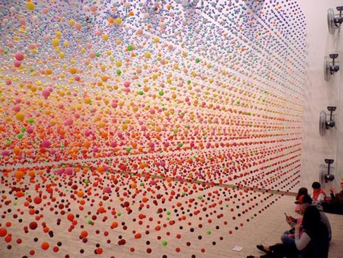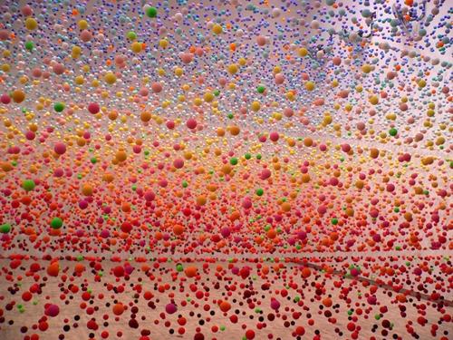 Атомный СаввасОригинальное название инсталляции Найка Савваса (Nike Savvas) - «Атомный зал: полный любви, полной удивления». Это — чудная комната застывших «атомов» собирает возле себя множество людей, отпуская их слегка взволнованными. Приостановленные шарики - «атомы» сделаны из пенопласта, поэтому они чрезвычайно легкие, и держаться за счет нейлоновых ниток (леска), невидимой сеткой стягивающих их в ряды. Все шарики очень яркие и создают широкий спектр цветов от красного до белесо-голубого. Некоторое время вся инсталляция неподвижно висит в воздухе, но наступает момент, и «атомы» начинают хаотично колебаться под влиянием порывов ветра от установленных по периметру вентиляторов. «Атомные» колебания — беспокойны и необычайно красивы, порою их резонанс создает иллюзию вибрирующего здания.![]() ![]() ![]() KAK.RU |