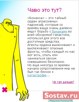 "Бонаны" завоевывают Интернет. umistudio разработала промо-портал для бренда BonanzaПетербургская компания umistudio разработала промо-портал для бренда Bonanza, принадлежащего Группе JFC. Портал содержит информацию об "Организации Бонанза", осуществляющей защиту человечества от Бонанов, сервис знакомств, промо-игры и интернет-радиостанцию. В дальнейшем планируется расширять функционал портала за счет подключения модуля сетевых дневников и электронной почты. Рассчитанный на молодежную аудиторию, ресурс выдержан в "падонковской" стилистике, популярной в российском сегменте сети, и содержит большое количество "креативофф", посвященных злу, которое несут в мир Бонаны, и бескомпромиссной борьбе, которую ведут с ними активисты организации "Бонанза". По замыслу разработчиков, свободный от жестких цензурных рамок сайт должен стать основным средством контакта с молодежной аудиторией бренда. Посетители bonanzaland.ru смогут оставлять на сайте свой креатив, посвященный Бонанам. Талантливые "аффтары" будут поощрены. Напомним, телевизионная реклама бренда Bonanza была создана агентством BBDO Moscow, а графику торговой марки и дизайн упаковки разработали специалисты Depot WPF Brand & Identity. ![]() ![]() Состав творческой группы Umistudio Руководитель проекта, идея: Сергей Котырев Арт-директор: Юрий Smitana Перфилов Дизайнер-иллюстратор: Сергей Adui Ратников Редактор: Кирилл Жданов Копирайтеры: Михаил Кочерыжкин, Александра Власюк, Елизавета Рыбакова Разработчики: Сергей Lyxsus Антонинко, Владимир Кольцов, Евгений Глазырин, Антон Прусов, Наталья Сорокина, Виктория Черняк, Илья Алексеев Сисадмин: Данила Колосов Клиентский контроль: Андрей Семенов |