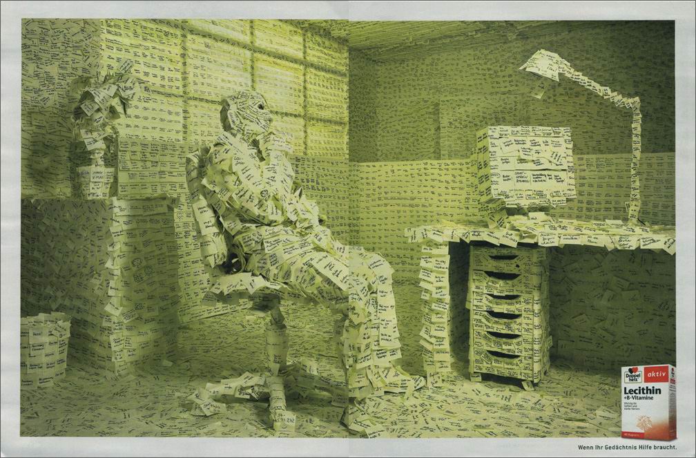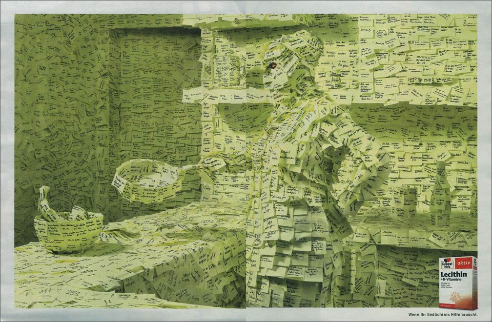 Когда ваша память нуждается в помощи - утверждает слоган на этих плакатах, рекламирующих лекарство Lecitin. Реклама - стены, фигуры, предметы "создана" из множества наклеек-напоминаний