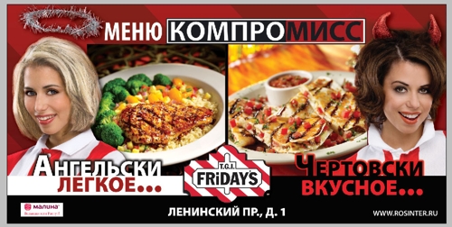 TGI-Fridays на выбор отправит в ад или в райНа московских улицах появилась наружная реклама нового предложения ресторанов TGI-Fridays, которое носит название "Компромисс". Как сказали Sostav.ru, посетителям, которые решат пойти с рестораном на "компромисс", на выбор предложат два меня: Ангельски легкое или Чертовски вкусное. Принять решения потенциальным посетителям должны помочь биллборды, размещенные, например, на Ленинском проспекте. Акция "Компромисс" действует во всех московских ресторанах, кроме расположенного в аэропорту Шереметьево-2. |
