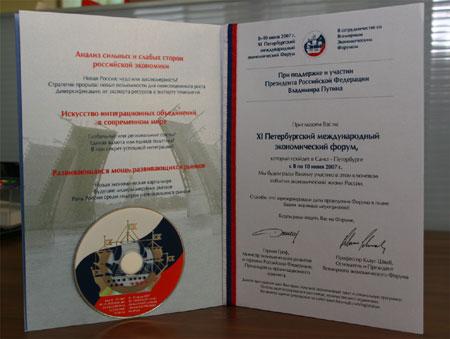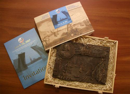 Петербургскими кондитерами были изготовлены плитки фигурного шоколада в форме старинной гравюры с портретом Петра I и видом на акваторию Невы, упакованные в подарочные коробки из дерева. К коробкам с шоколадом прилагались именные приглашения на Петербургский международный экономический форум, подписанные Германом Грефом, министром экономического развития и торговли РФ, и Клаусом Швабом, основателем и президентом Всемирного экономического форума. В приглашения был вложен диск с информационным фильмом о мероприятии. Подарочные наборы ждали гостей Давосского форума в гостиничных номерах.