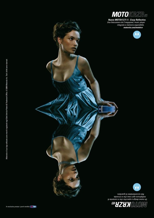 Зеркальная реклама для MotoKRZRКрасивая реклама для нового телефона-раскладушки с зеркальной лицевой панелью MotoKRZR, выполненная итальянским агентством D'Adda, Lorenzini, Vigorelli, BBDO из Милана. Реклама напоминает, что этот телефон для девушек, которые любят любоваться своим отражением, слоган "Сумасшедшее отражение". |