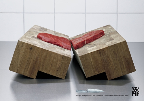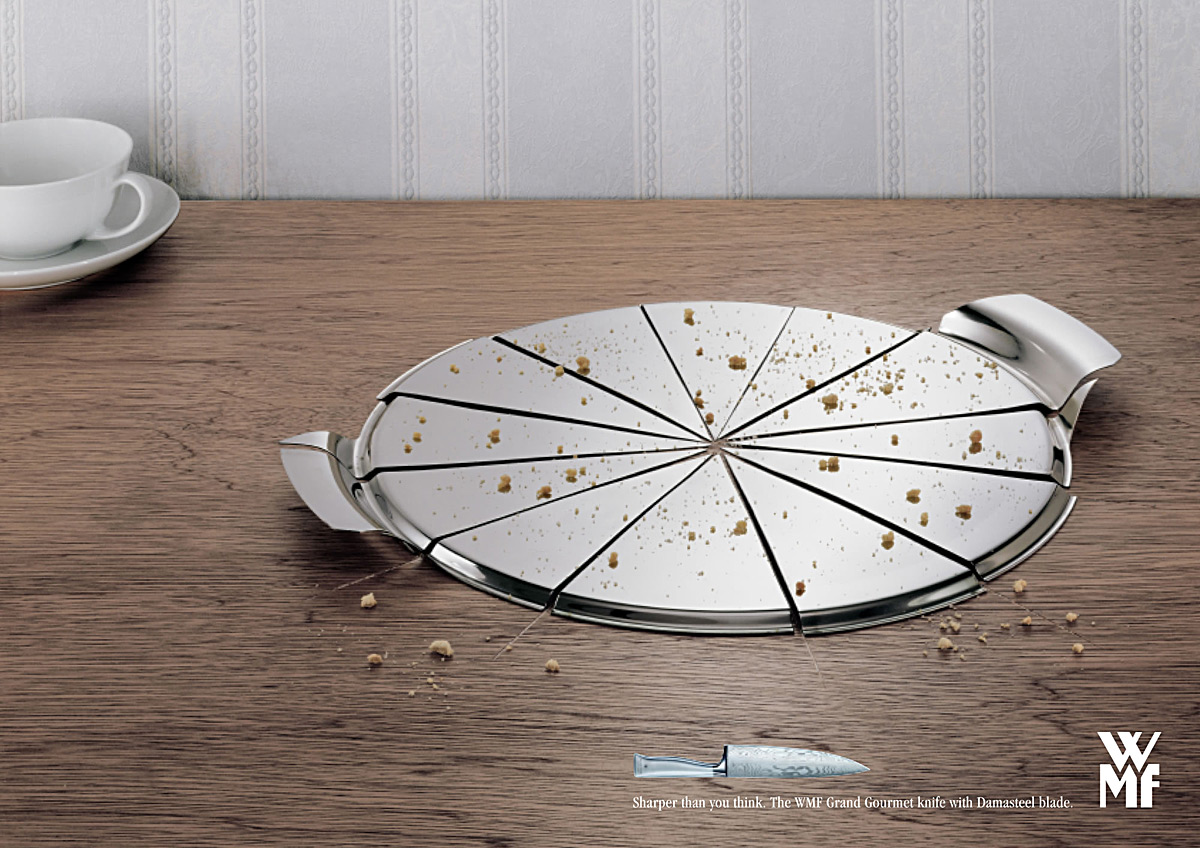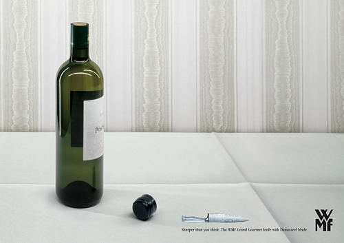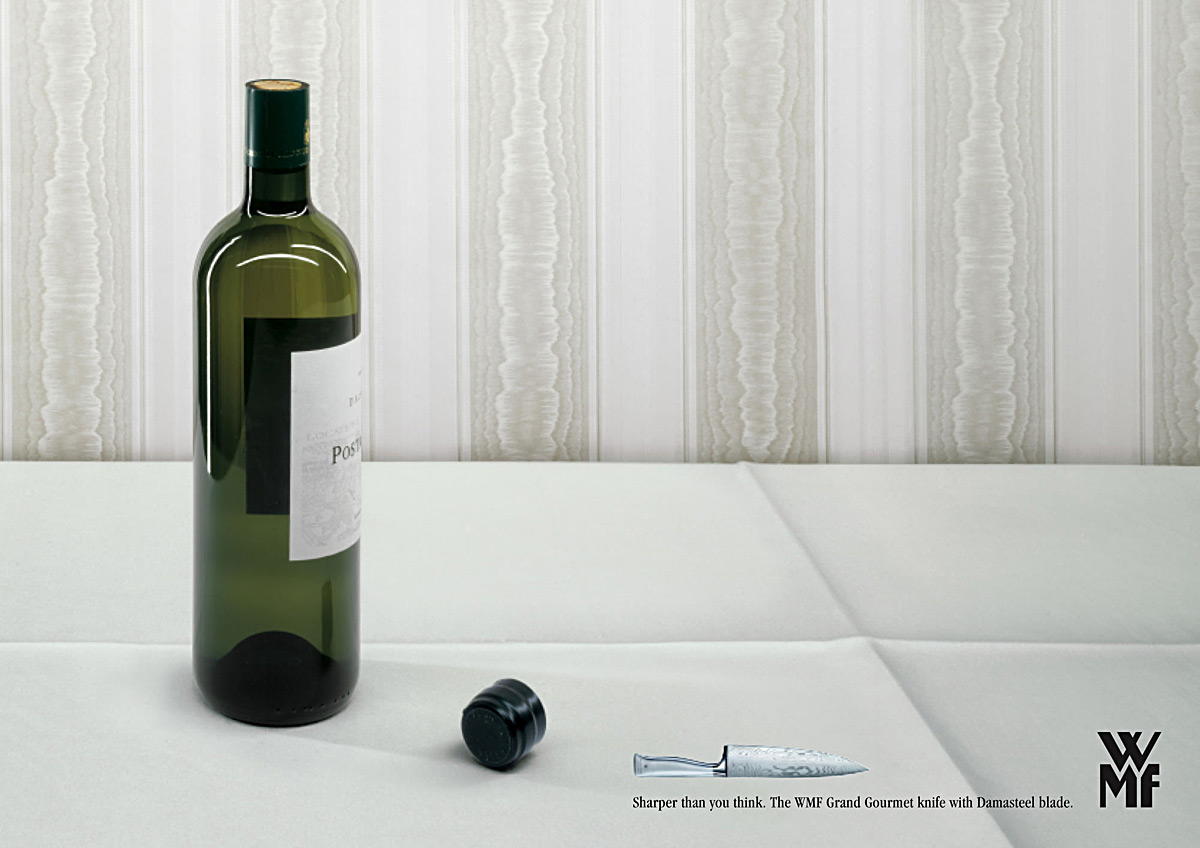 Агентство KNSK Werbeagentur призывает осторожнее использовать ножи WMFАгентство KNSK Werbeagentur призывает вас быть внимательнее при использовании ножей WMF, ведь они такие острые, что вы можете нечаянно разрезать поднос, разделочную доску или отрезать горлошко бутылки, открывая ее. Но вот в чем странность или недоработка агентства: почему винная бутылка пустая, а пробка все еще закрыта? Надпись: "Острее, чем вы думаете. WMF Grand Gourmet knife (Великий нож Гурмана) с лезвием из дамасской стали." Агентство: KNSK Werbeagentur, Германия Творческий директор: Anke WInschewski, Vappu Singer Копирайтер: Daniela Schubert Арт директор: Jan Blumentritt |