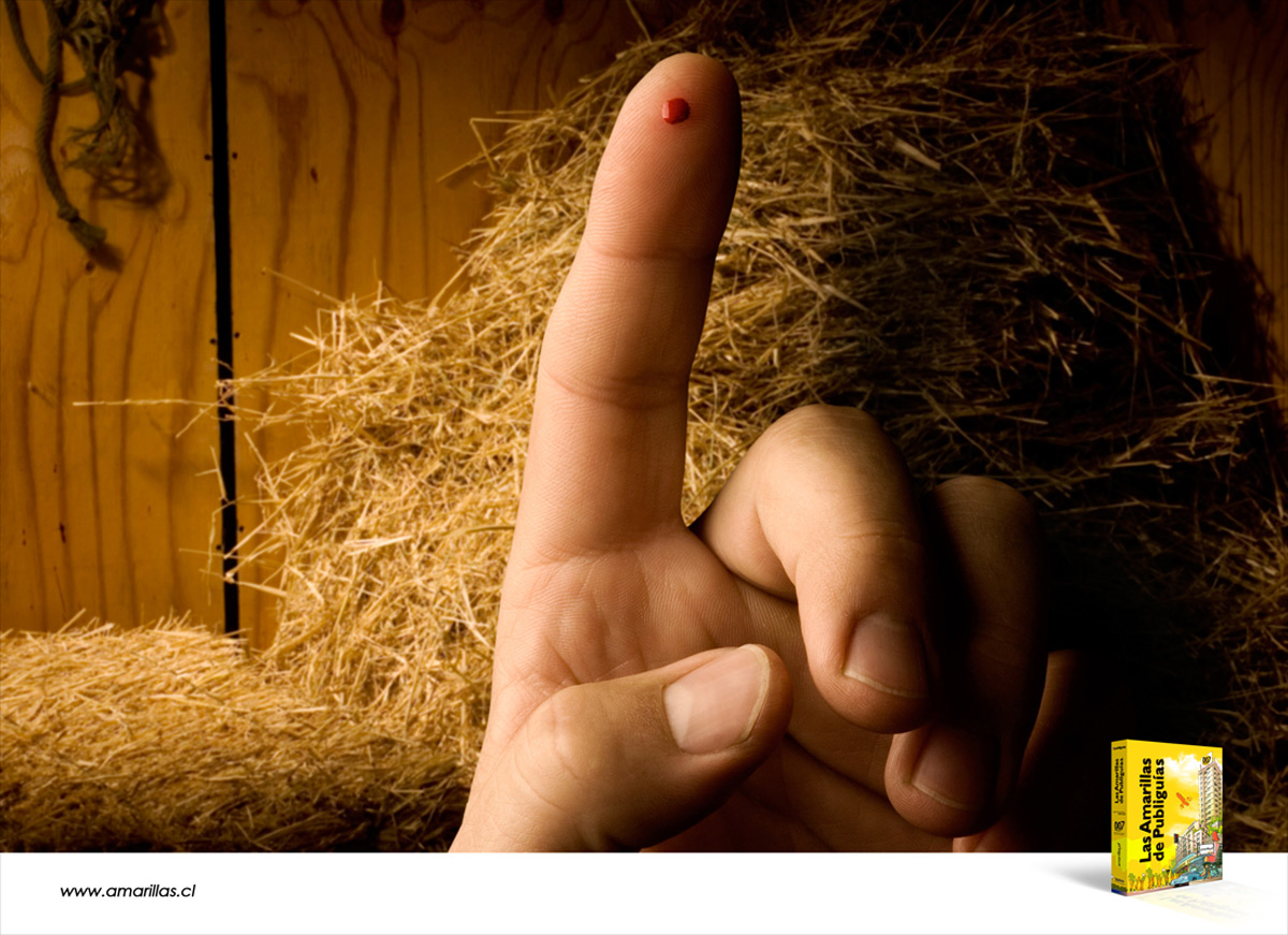 Иголку в стоге сена вам поможет найти агентство McCann Erickson и справочник Yellow PagesПеред вами оригинальный рекламный плакат от агентства McCann Erickson для всемирно известного информационного справочника Yellow Pages (Желтые Страницы). Основной смысл рекламы в том, что вы даже можете уколоться иголкой, найдя ее в стоге сена с помощью этого справочника. Надпись: www.amarillas.cl Агентство: McCann Erickson, Сантьяго, Чили Творческий директор: Guido Puch and Alvaro Camilla Арт директор: Manuel Aldunate and Hernan Almendras Копирайтер: Manuel Aldunate Фотограф: Marcelo Khon |
