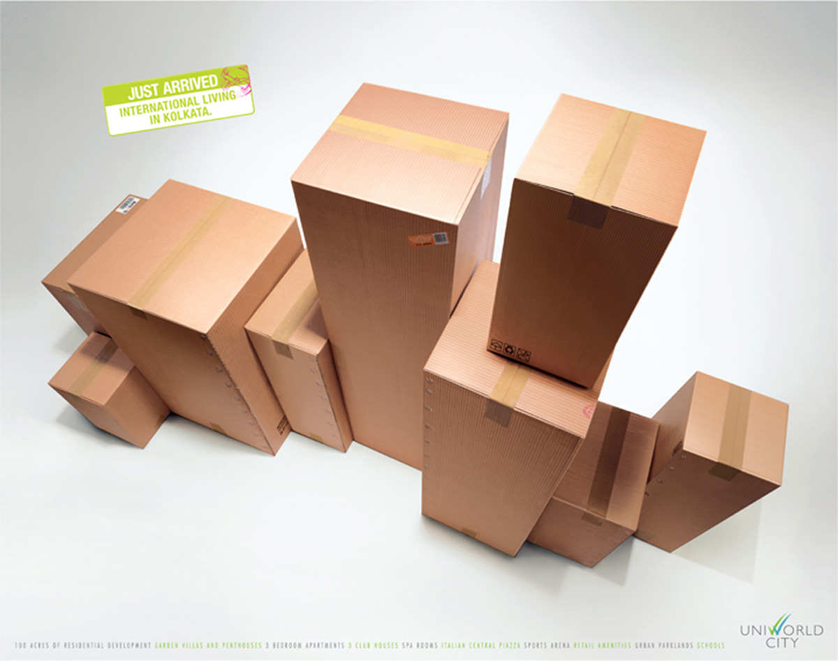 Жилой комплекс из коробок от агенства DDB Mudra Communications для UniWorld CityИндийское агентство DDB Mudra Communications, создавая эту рекламную кампанию для жилого квартала UniWorld City в Калькутте, предлагает вам представить, что вы уже переехали туда жить, но еще не распаковали коробки. А коробки на принтах размещены так, что становятся похожими на жилой комплекс. Надпись: "Только что прибывший. Международное проживание в Калькутте. UniWorld City 100 акров жилой застройки; садовые виллы и пентхаусы; квартиры с 3 спальнями; 3 клубных здания; комнаты SPA; итальянская центральная базарная площадь; спортивная арена; мелкие удобства; городские парковые насаждения; школы" Агентство: DDB Mudra Communications, Новый Делли, Индия Арт директор: Arnab Chatterjee and Nabha Shetye Копирайтер: Kapil Dhawan and Talha Bin Mohsin Фотограф: Ashish Chawla |
