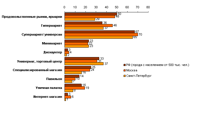 Две трети жителей крупных российских городов совершают свои покупки в супермаркетах и универсамахИсследовательский Холдинг Romir продолжает публиковать результаты исследования, посвященного стилю жизни россиян. В опросе, проведенном в декабре 2006 года, приняло участие более 10 тысяч жителей крупных российских городов старше 15 лет. Статистическая погрешность исследования не превышает ±1%. На вопрос «В каких магазинах регулярно делаются покупки?» ответы респондентов распределились следующим образом: ![]() В ходе исследования выяснилось, что жители крупных городов с населением более 500 тысяч человек чаще всего совершают свои покупки в супермаркетах и универсамах (67%). На втором месте по посещаемости оказались продовольственные рынки и ярмарки (50%). На третьем – гипермаркеты, универмаги и торговые центры (36% и 33% соответственно). Четверть респондентов ответили, что они регулярно совершают покупки в минимаркетах и специализированных магазинах. А вот интернет-магазины и дискаунтеры оказались совсем непопулярными среди жителей крупных городов России (по 3% и тот и другой). Отметим, что москвичи значимо чаще пользуются интернет-магазинами, чем жители других крупных городов (6%). Москвичи и петербуржцы чаще всего покупают товары в супермаркетах и универсамах (70% и 65% соответственно). Продовольственные рынки среди жителей Москвы и Санкт-Петербурга оказались менее востребованными (48% и 29% соответственно). В то время как, к примеру, 82% жителей Иркутска покупки совершает именно на продовольственных рынках. Такие магазины как гипермаркеты наиболее востребованы в Москве (46%), Красноярске (44%), Иркутске (41%), Санкт-Петербурге (37%). Реже всего продукты в гипермаркетах покупаются жителями Саратова (10%). Однако каждый четвертый саратовец покупает товары в минимаркетах. www.rmh.ru |